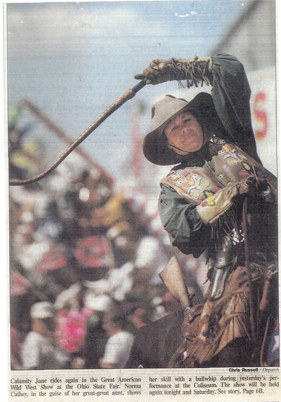 As Norma tells her stories of Calamity Jane, she displays the spirit of that outspoken woman by shooting off her mouth and cracking her ten foot bullwhip. Unlike the real Calamity who used language that would curl your toes, Norma breaks out in old time song now and then like “Red Wing,” “Buffalo Gals,” and “Red River Valley.”